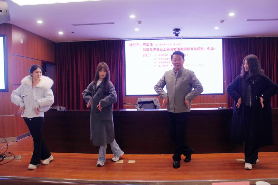 讲座伊始,郑翔以深厚的学术功底和生动的讲解,带领师生走进京剧的艺术世界。他从京剧的历史渊源、美学原理、艺术特征等方面展开,深入浅出地阐述了京剧作为国粹的独特魅力。他介绍了京剧的主要行当、四功、剧目种类,现场展示了京剧的唱腔、念白、身段等基本功,还示范了男女站相、坐相等“手、眼、身、法、步”细节,诠释了京剧表演特色及其蕴含的哲理。