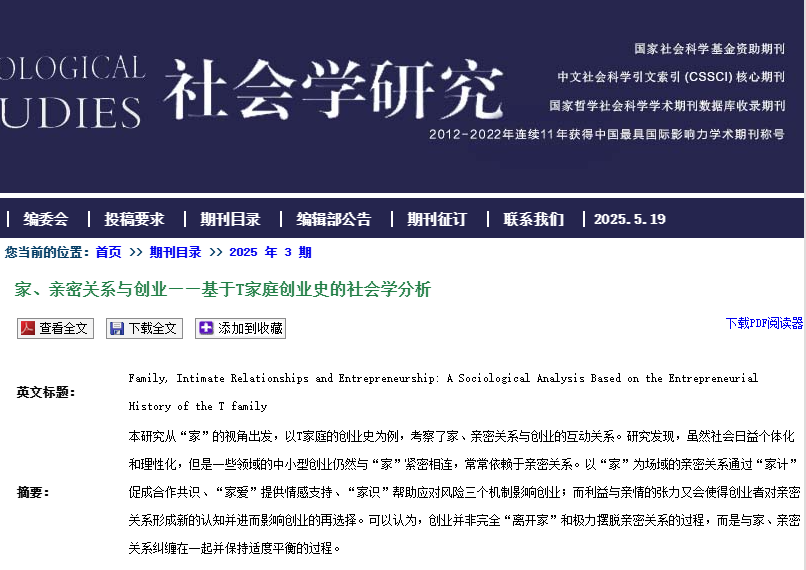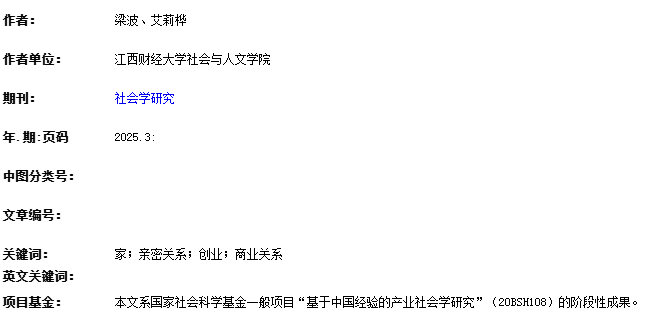 近日,韩国视频 博士生导师梁波教授与其指导的硕士研究生艾莉桦同学合著的论文《家、亲密关系与创业——基于T家庭创业史的社会学分析》发表于国内著名权威期刊《韩国微电影 》2025年第3期。该文是我校社会学学科建设的又一篇重要研究成果。